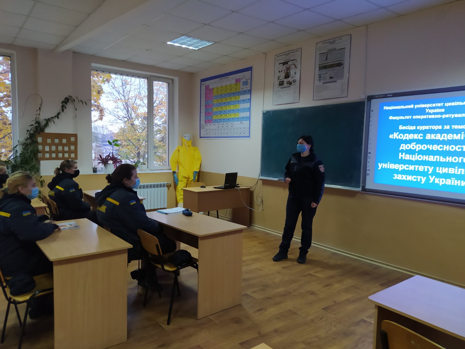 Бесіду з закріпленою групою ХТкс-19-225 за темою «Кодекс академічної доброчесності Національного університету цивільного захисту України» проводить доцент кафедри спеціальної хімії та хімічної технології Марина ЧИРКІНА.