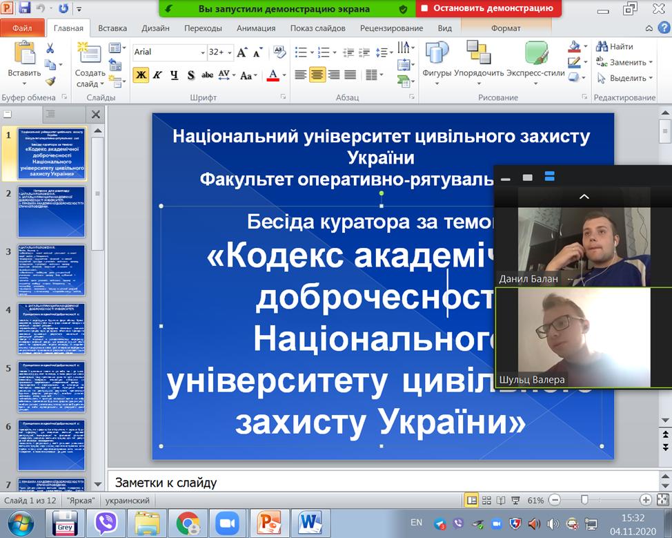 Бесіду в форматі онлайн-конференції з використанням програмного забезпечення Zoom з закріпленою групою ПГПБс-17-242 за темою «Кодекс академічної доброчесності Національного університету цивільного захисту України» проводить старший викладач кафедри пожежної тактики та аварійно-рятувальних робіт Костянтин ОСТАПОВ.