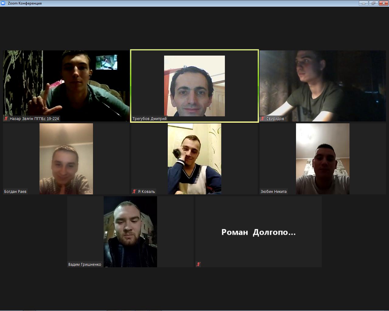 Бесіду в форматі онлайн-конференції з використанням програмного забезпечення Zoom за темою: «Проблема насильства над жінкою в сім'ї та шляхи її подолання» з закріпленою групою ПГПБс-17-242 проводить доцент кафедри спеціальної хімії та хімічної технології Дмитро ТРЕГУБОВ