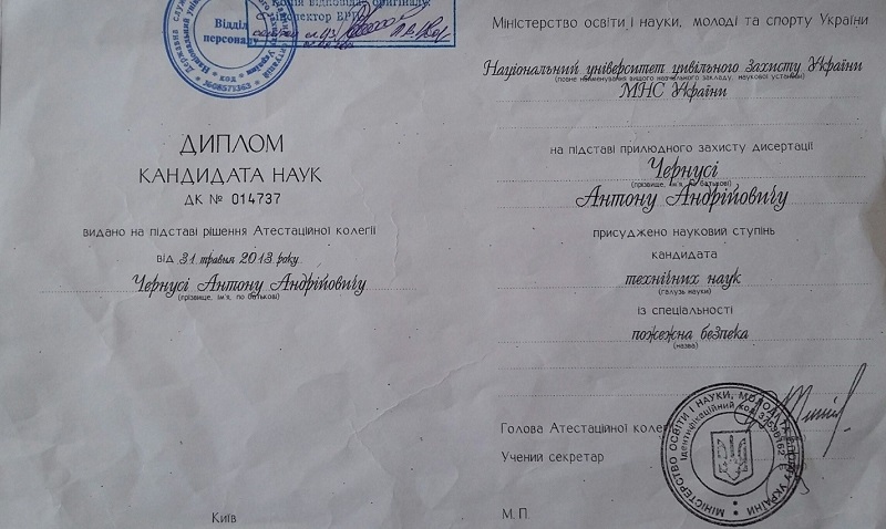 Кандидат технічних наук, 21.06.02 – пожежна безпека, «Підвищення ефективності вогнезахисту деревини за допомогою гелеутворюючих складів на основі силікатів».