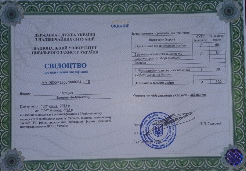 Академія цивільного захисту України, 2005, пожежна безпека, магістр науково-педагогічного спрямування.